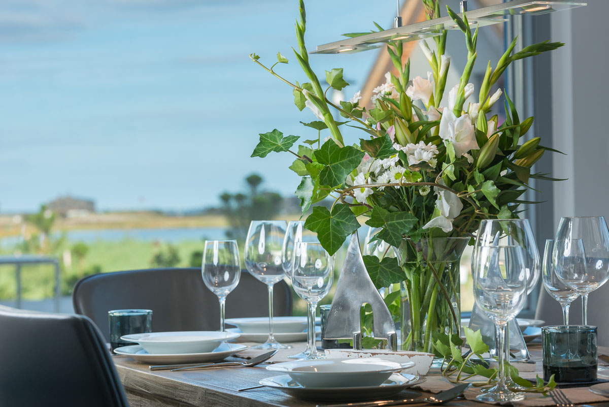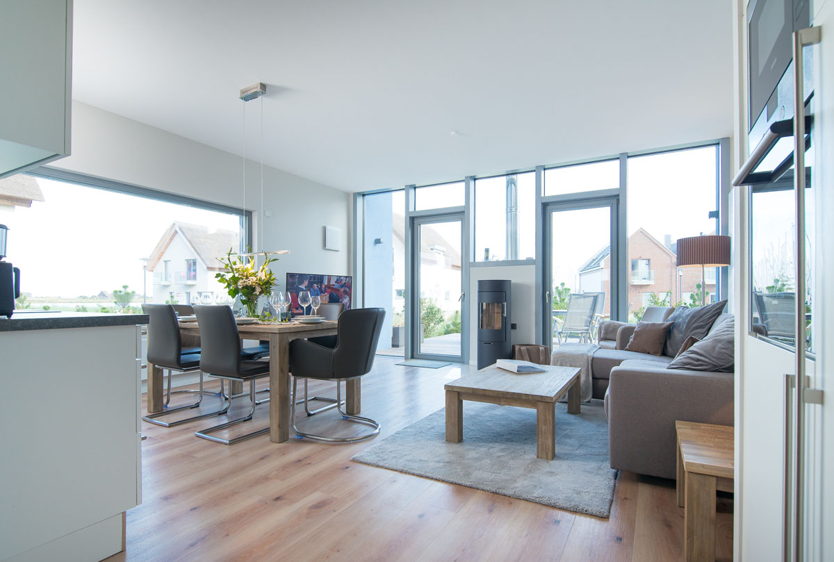 Neues, qualitativ hochwertig eingerichtetes Domizil mit finnischer Sauna, luxuriösem Wohn-/Essbereich, Kamin, 3 Schlafzimmer (insgesamt 6 Erwachsenenbetten), großzügiger holzgetäfelter Terrasse.