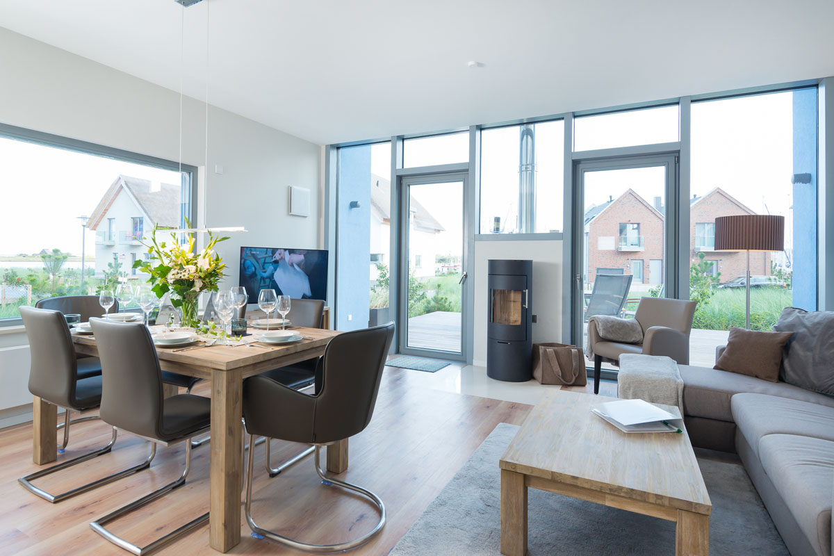 Neues, qualitativ hochwertig eingerichtetes Domizil mit finnischer Sauna, luxuriösem Wohn-/Essbereich, Kamin, 3 Schlafzimmer (insgesamt 6 Erwachsenenbetten), großzügiger holzgetäfelter Terrasse.